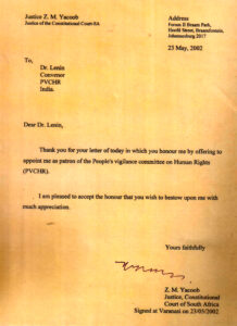 Shruti Nagvanshi attends a celebratory lunch hosted by the President of India after being honored as one of the Top 100 Women Achievers of India in 2016 by MWCD and Facebook for her work in ‘Access to Justice: Protecting Women and Their Rights.Shruti Nagvanshi, alongside her life partner Lenin Raghuvanshi and their son Kabeer Karunik, at the ceremony for the International Human Rights Prize of the City of Weimar, held in Weimar, Germany, on December 10, 2010Women of marginalized communities in Varanasi honor Shruti Nagvanshi for being recognized among the Top 100 Women Achievers of India in 2016 by MWCD and Facebook, celebrating her dedication to ‘Access to Justice: Protecting Women and Their Rights.Remembering Savitribai Phule: Shruti Nagvanshi marks her inspiring contribution to education and equalitAt the heart of PVCHR: Shruti Nagvanshi with key members driving human rights initiativesShruti Nagvanshi at the forefront, negotiating for justice and rights of the underservedRaising voices, shaping change – Shruti Nagvanshi for a brighter, inclusive India.Moments of connection: Shruti Nagvanshi with family and a Korean photographer.Shruti Nagvanshi with Dr. Lenin Raghuvanshi at the International Human Rights Prize ceremony, Weimar, Germany, 2010.Shruti Nagvanshi honored and welcoming Ms. Helma Ritscher at the inauguration of Ghalib Global Literature ClubShruti Nagvanshi with Bollywood icon Aamir Khan and staff Shabana Khan at Satyamev Jayate.Knowledge exchange in action: Shruti Nagvanshi with Shoolini University faculty and students at PVCHR.Championing children’s rights: Shruti Nagvanshi with Nobel Laureate Kailash Satyarthi at Kabirchaura MathPVCHR team, led by Shruti Nagvanshi, receives a significant letter in 2005Letter from the Patron: Justice Z.M. (Zak) Yacoob, Former Judge of the Constitutional Court of South Africa and Chancellor of the University of Durban, South Africa.Dominique Lapierre shares his journey and message at Benares Convention, 2003.Celebrating women’s leadership: Shruti Nagvanshi featured in UN Women India’s coffee table book.